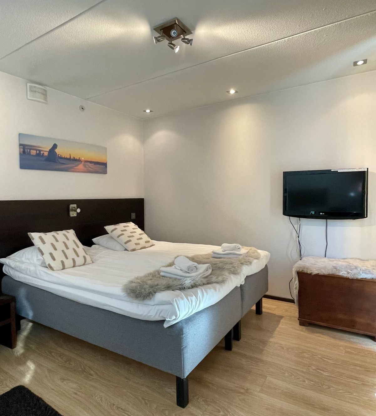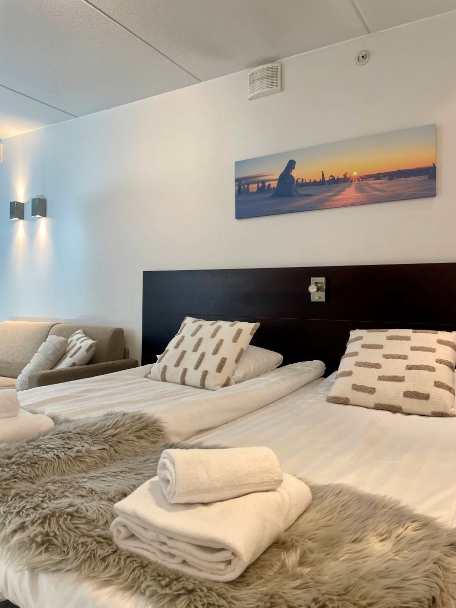 Kaksi yhden hengen vuodetta sekä lisäksi vuodesohva kahdelle alle 10-vuotiaalle lapselle tai yhdelle aikuiselle.